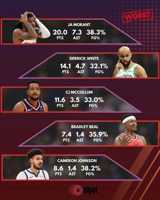 洛杉矶快船更衣室的空气仿佛凝固了,3胜5负西部第12的战绩像一记响亮的耳光,抽在这支休赛期豪组四巨头的“银河战舰”脸上。当美媒将比尔、保罗、莫兰特、怀特和麦科勒姆列为开季最令人失望五人组时,快船竟独占两席——场均7.4分的比尔和2.3分的保罗,正用生涯最低效的表现摧毁球队的争冠梦想。