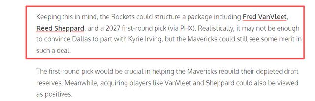 赛季未开打,范弗里特就提前赛季报销,但是火箭没有慌乱,急于补上这一短板,而是尽力培养阿门、谢泼德,目前来说,火箭的培养计划成功了一小步,阿门在串联组织上的视野越来越开阔,谢泼德在进攻端愈发自信,不过,真正到了季后赛层面,两人去承担一号位的首发,显然还是不够牢靠。火箭大概率会在交易截止日前完成一号位的升级。在独行侠、快船都陷入困境后,火箭在交易市场上能选择的球员不少。就在今天美媒露天看台建议,火箭应该打包范弗利特、谢泼德与2027年首轮签(通过太阳)的3换1报价,追求独行侠的凯里・欧文。